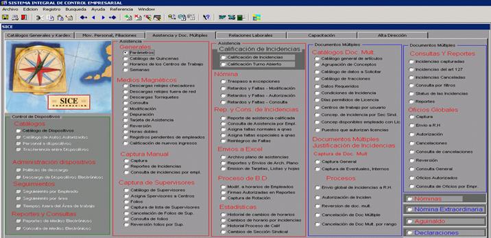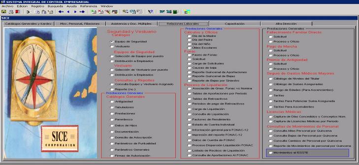 · Ud. podrá controlar todo lo referente a las prestaciones laborales de su dependencia ( seguros de vida, seguros de gastos médicos, vales de despensa, premios, fondos de ahorro y cualquier otra prestación que requiera) · Controlara todo lo referente a la asistencia del empleado ( horarios, faltas, justificaciones, retardos, tiempos muertos, etc.) con descargo directo de sus medios de control de acceso y la calificación de sus justificaciones de acuerdo a las políticas de su dependencia · Podrá cumplir con los pagos a terceros y controlar ISSSTE, FONACOT, liquidación del FONAC, · Mantener información del inventario de ropa y equipo de seguridad, comisiones mixtas |